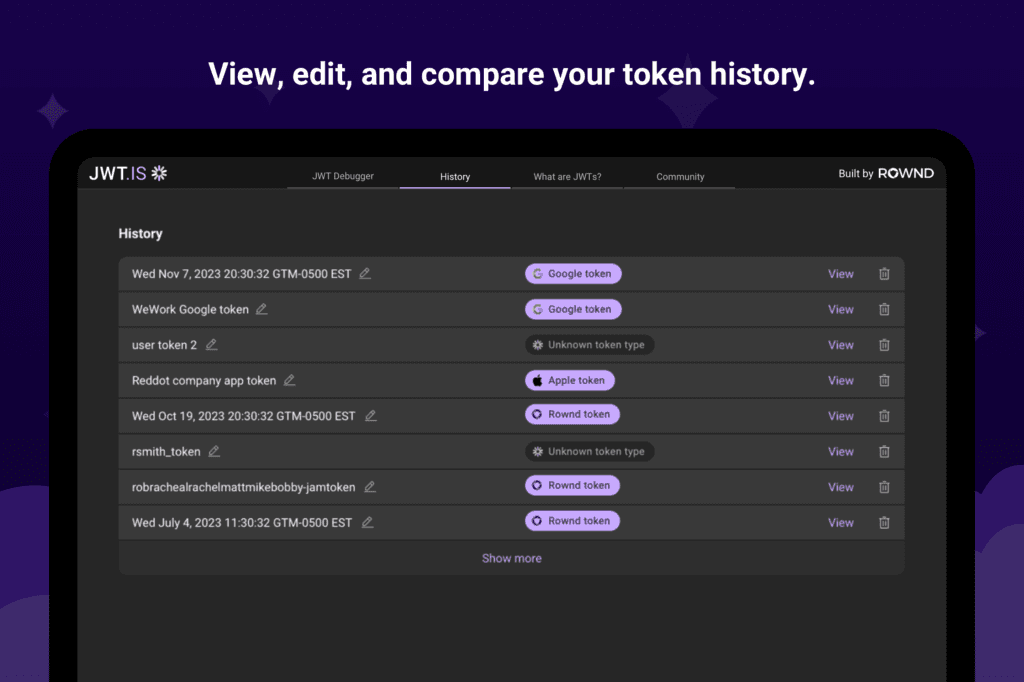 With JWT.is you can debug your JWTs, validate them with JWK endpoints, view your recently viewed tokens, and more.